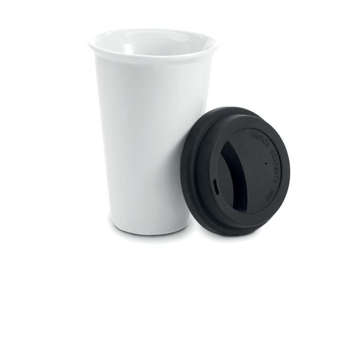 Kubek ceramiczny o podwójnych ściankach z silikonowym wieczkiem. Idealny do gorących napojów. Tampodruk nie jest odporny na działanie zmywarki. Transfer na ceramice jest odporny na działanie zmywarki.