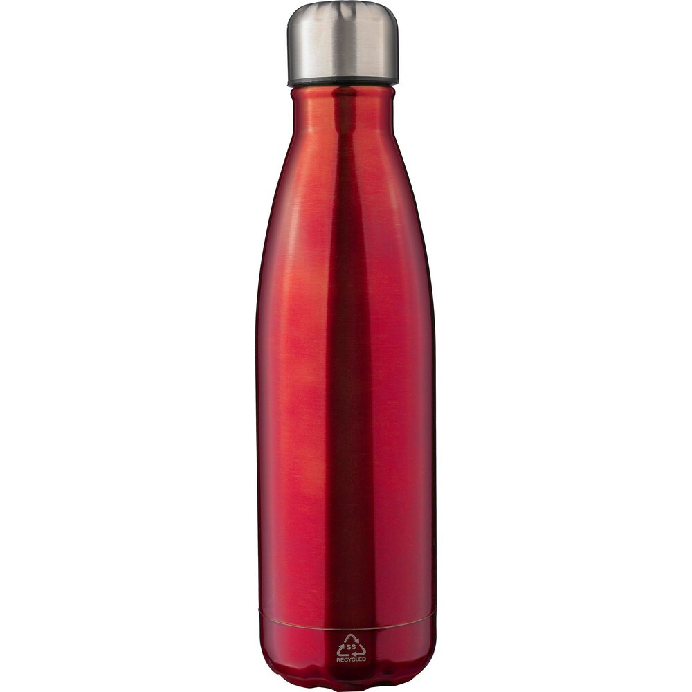 Butelka termiczna 500 ml, posiada podwójne ścianki ze stali nierdzewnej z recyklingu z próżnią między ściankami, co spowalnia oddawanie temperatury na zewnątrz, zachowując funkcje termosu, ikona stali nierdzewnej z recyklingu na produkcie, zapakowana w brązowy kartonik