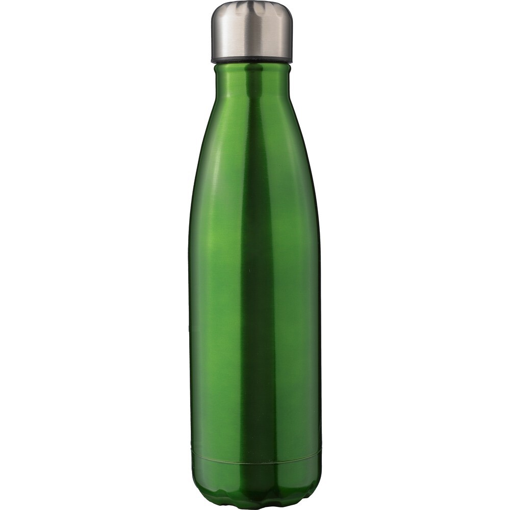 Butelka termiczna 500 ml, posiada podwójne ścianki ze stali nierdzewnej z recyklingu z próżnią między ściankami, co spowalnia oddawanie temperatury na zewnątrz, zachowując funkcje termosu, ikona stali nierdzewnej z recyklingu na produkcie, zapakowana w brązowy kartonik