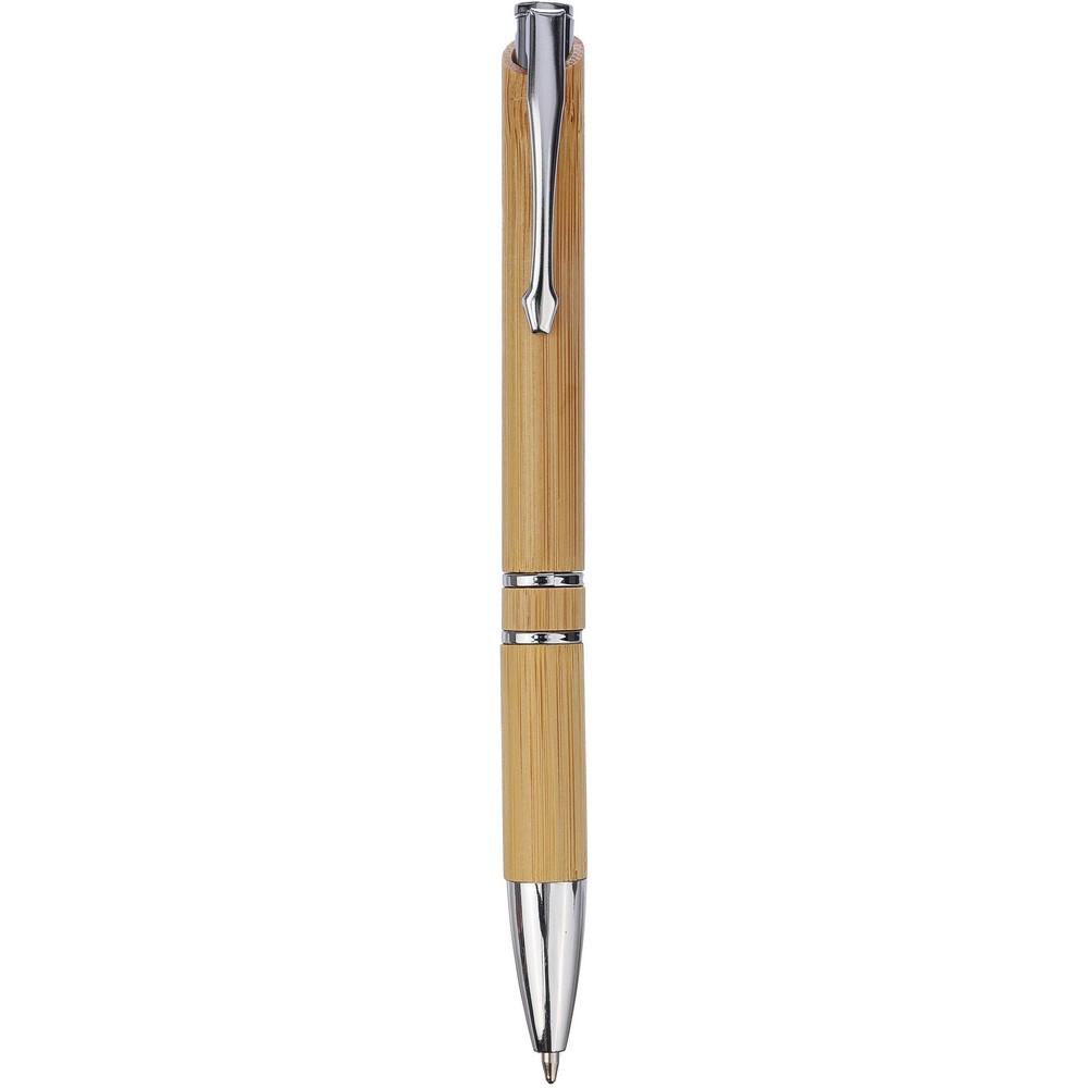Długopis z chromowanymi detalami, klip ułatwiający zawieszanie na kieszeni albo okładce notatnika, wkład w czarnym kolorze, długość pisania ok. 800 m, produkt wykonany z bambusa, plastiku i metalu