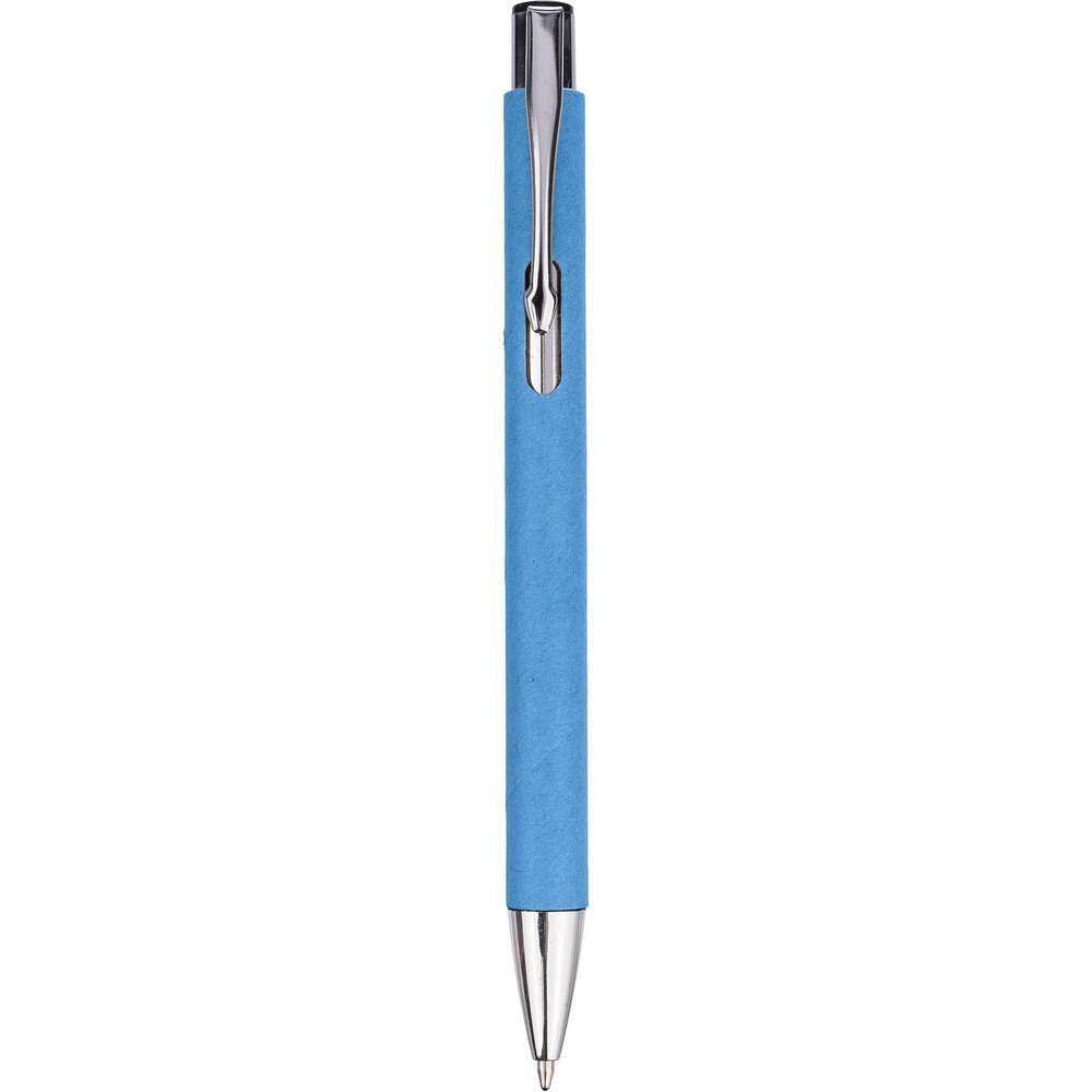 Długopis, klip ułatwiający zawieszanie na kieszeni albo okładce notatnika, wkład w czarnym kolorze, trzon wykonany z papieru z recyklingu, klips z metalu, końcówka z plastiku