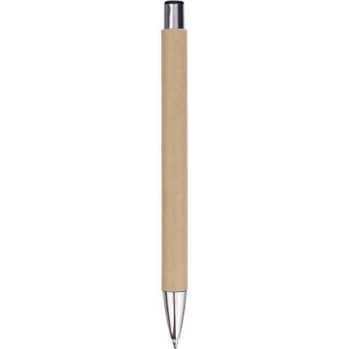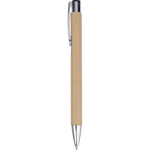Długopis, klip ułatwiający zawieszanie na kieszeni albo okładce notatnika, wkład w czarnym kolorze, trzon wykonany z papieru z recyklingu, klips z metalu, końcówka z plastiku