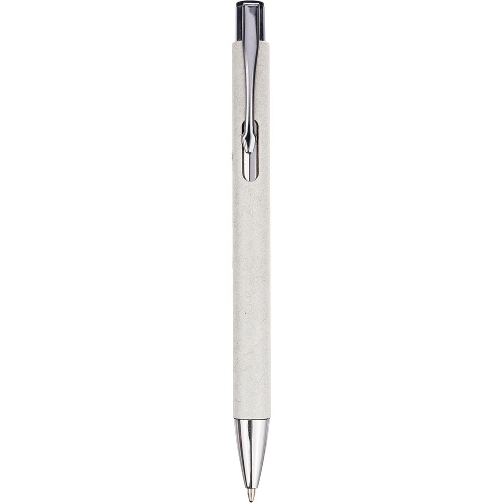Długopis, klip ułatwiający zawieszanie na kieszeni albo okładce notatnika, wkład w czarnym kolorze, trzon wykonany z papieru z recyklingu, klips z metalu, końcówka z plastiku