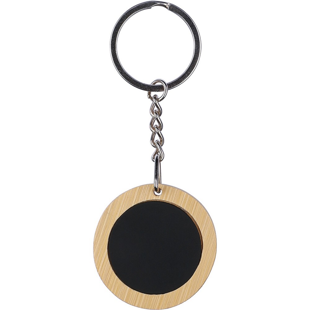 Brelok do kluczy z czarną gumowaną płytką do grawerowania, po wygrawerowaniu logo będzie widoczne w błyszczącym chromie, zapakowany w brązową kopertę kartonową, produkt wykonany ze stali nierdzewnej i bambusa