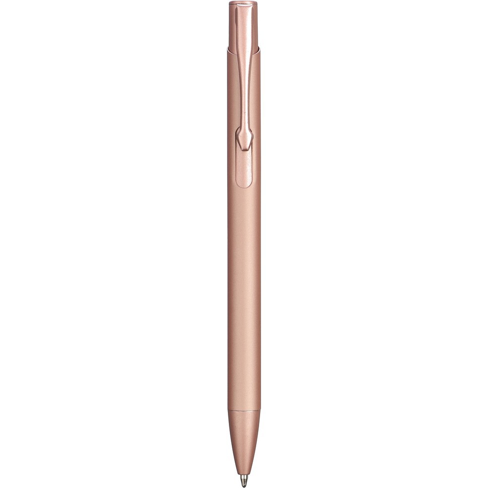 Długopis aluminiowy z recyklingu z gumowaną powłoką na korpusie, ikona aluminium z recyklingu wygrawerowana na produkcie, wkład w niebieskim kolorze, produkt wykonany z aluminium i ABS.