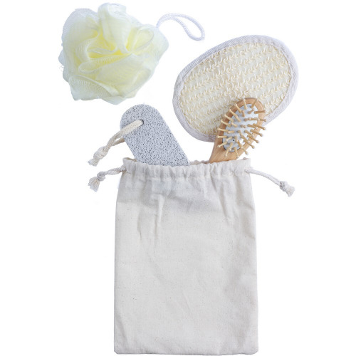 Zestaw kąpielowy, składa się ze szczotki bambusowej, miękkiej gąbki, gąbki do szorowania i pumeksu, wszystkie elementy zapakowane w bawełniany woreczek, produkt wykonany z bawełny, drewna i PE
