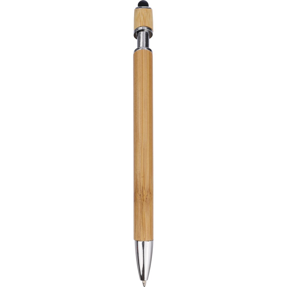 Długopis, touch pen z chromowanymi metalowymi detalami, końcówka touch pen umożliwiająca obsługę ekranów dotykowych, klip ułatwiający zawieszanie na kieszeni albo okładce notatnika, wkład w niebieskim kolorze, długość pisania ok. 800 m, produkt wykonany z bambusa, plastiku i metalu