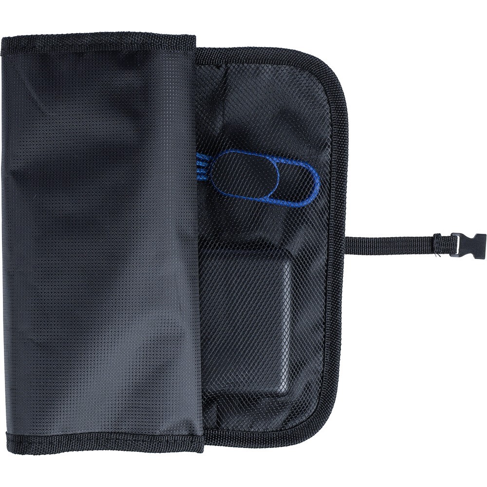 Zwijana torba podróżna do przechowywania kabli i urządzeń ładujących, klamra zapewniająca szczelność torby podczas podróży, różne rodzaje kieszeni wewnątrz, produkt wykonany z poliestru