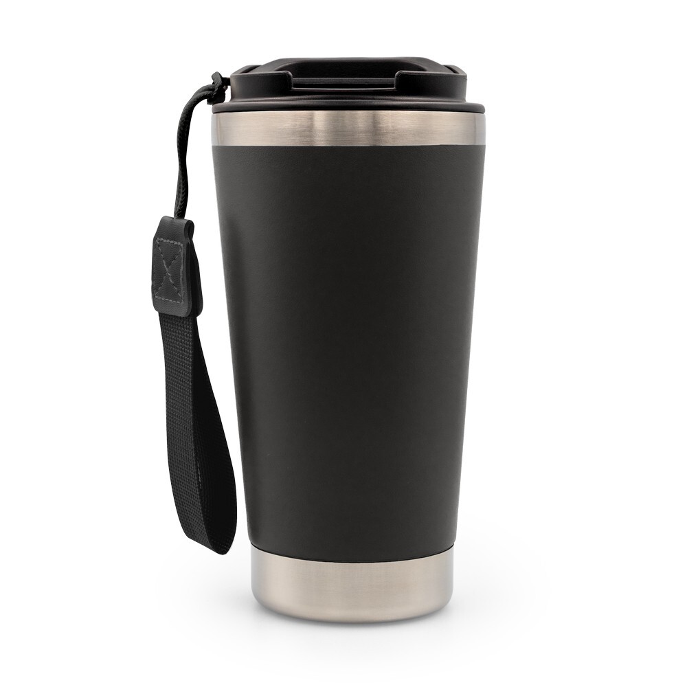 Kubek termiczny 500 ml posiada podwójne ścianki ze stali nierdzewnej z próżnią między ściankami, co spowalnia oddawanie temperatury na zewnątrz, zachowując funkcje termosu, pasek zwiększający wygodę użytkowania, ikona stali nierdzewnej z recyklingu na produkcie, zapakowana w brązowy kartonik, produkt wykonany ze stali nierdzewnej, silikonu, PP, PU, poliestru