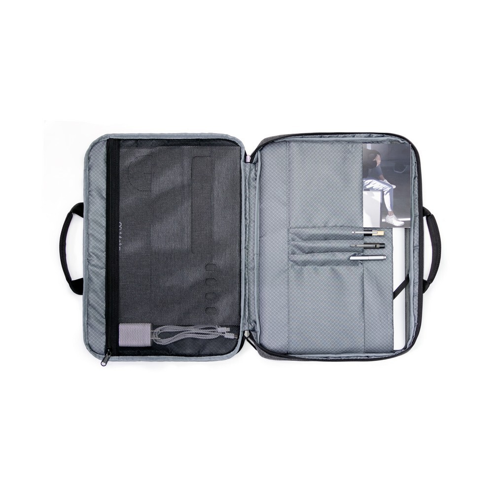Torba na laptopa 16" BrandCharger Specter 2, wielofunkcyjna torba, 3 tryby noszenia: do ręki, na ramię i przez ramię (jak plecak), wykonana z przetworzonych butelek PET, przestronna komora główna, wyściełany rękaw na 16" laptopa, kieszenie na tablet, telefon, ładowarkę, kable, wodoodporny i odporny na plamy materiał, sprawdzi się w podróży, pracy lub codziennym użytku, produkt wykonany z RPET i poliestru