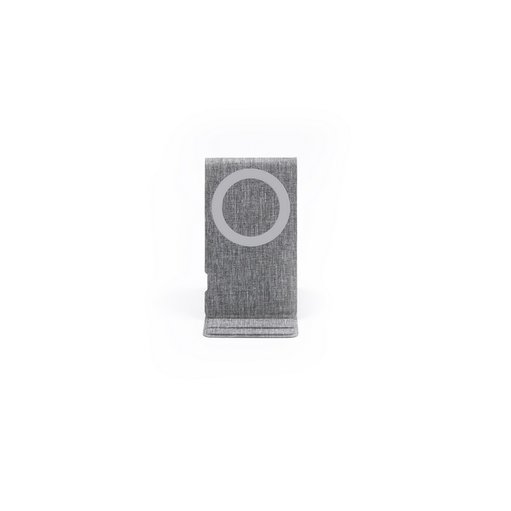 Ładowarka bezprzewodowa BrandCharger The Ascend Charge, wykonana z przetworzonych powtórnie butelek PET, szybkie bezprzewodowe ładowanie o mocy 15 W, kompatybilny z MagSafe, zawiera silikonową naklejkę MagSafe, regulowany kąt i składana konstrukcja, produkt wykonany z RPET, poliestru i kartonu