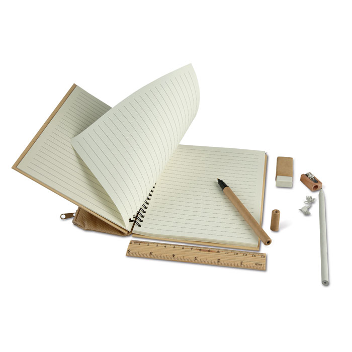 Ekologiczny zestaw biurowy: 60 kartkowy notes w linie w twardej okładce oraz piórnik wykonany z materiału non-woven zawierający papierowy ołówek i długopis z niebieskim wkładem oraz drewiane: linijka, temperówka i gumka.