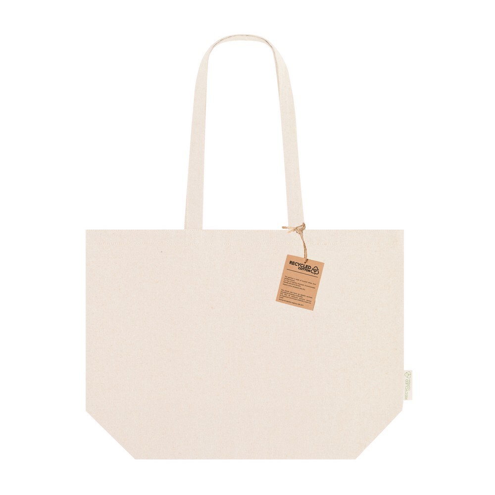 Torba na zakupy, posiada długie uchwyty umożliwiające noszenie na ramieniu, produkt wykonany z bawełny z recyklingu 220 g/m2