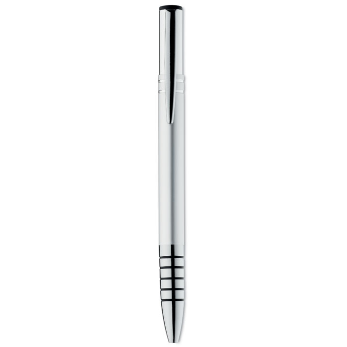 Przyciskany, aluminiowy długopis z chromowanym wykończeniem. Niebieski wkład.