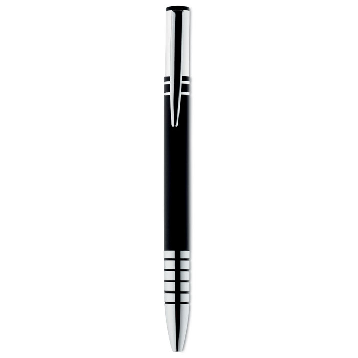 Przyciskany, aluminiowy długopis z chromowanym wykończeniem. Niebieski wkład.