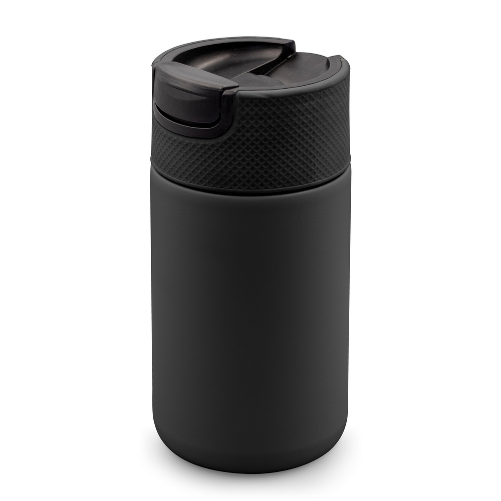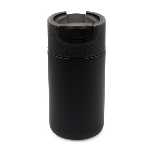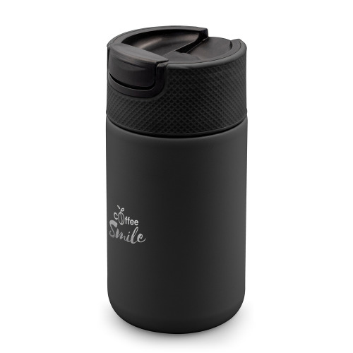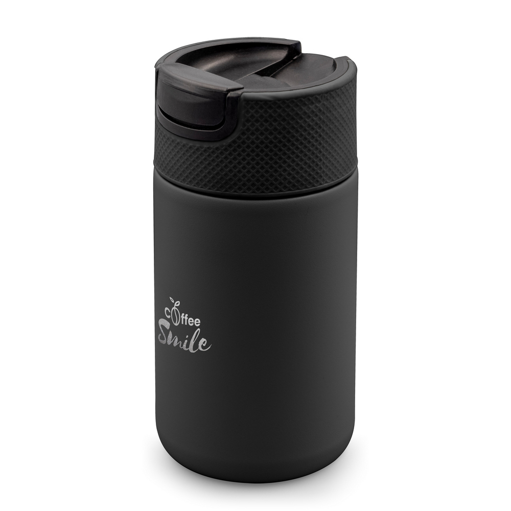 Kubek termiczny 400 ml Air Gifts, posiada podwójne ścianki ze stali nierdzewnej i ceramiki z próżnią między ściankami, co spowalnia oddawanie temperatury na zewnątrz, zachowując funkcje termosu, plastikowe wieczko z zamknięciem umożliwiającym obsługę jedną ręką, matowe wykończenie, produkt wykonany z metalu, ceramiki i plastiku, klasa termiczna: C +leakproof