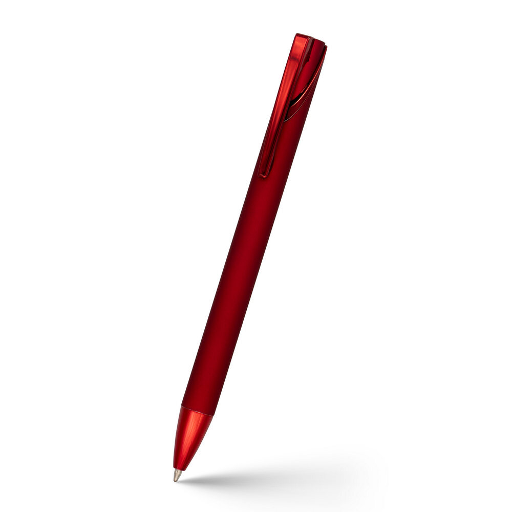 Długopis z kolorowym matowym trzonem i błyszczącymi elementami, wkład w niebieskim kolorze, czarne papierowe etui w komplecie, produkt wykonany z metalu