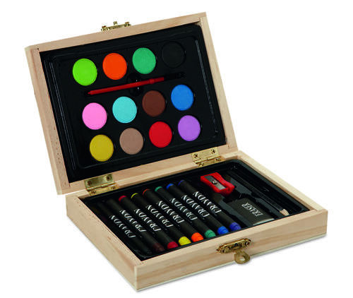 Mały zestaw do malowania w drewnianym opakowaniu. Zawiera 8 kredek, 12 farbek, 1 pędzelek, 1 temperówkę, 1 gumkę oraz ołówek.