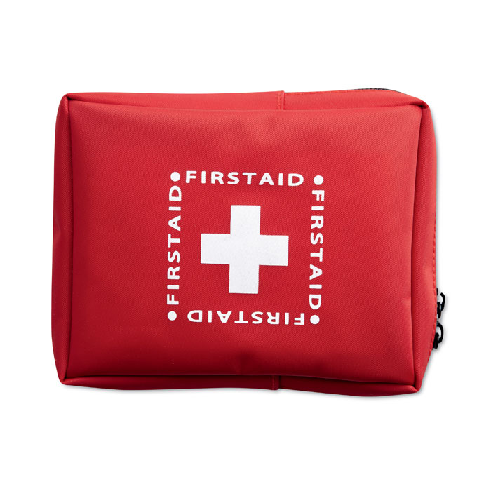 Zestaw pierwszej pomocy, zawiera koc ratowniczy, 10 bawełnianych patyczków do oczyszczania rany, rękawiczki, plastry, trójkątna chustę, chusteczki antybakteryjne, 2 bandaże. Opakowanie z materiału 230D.