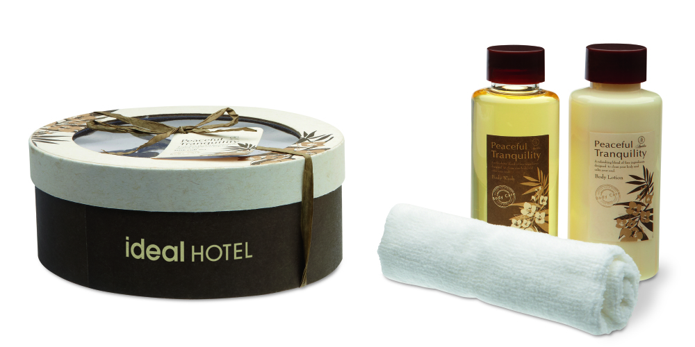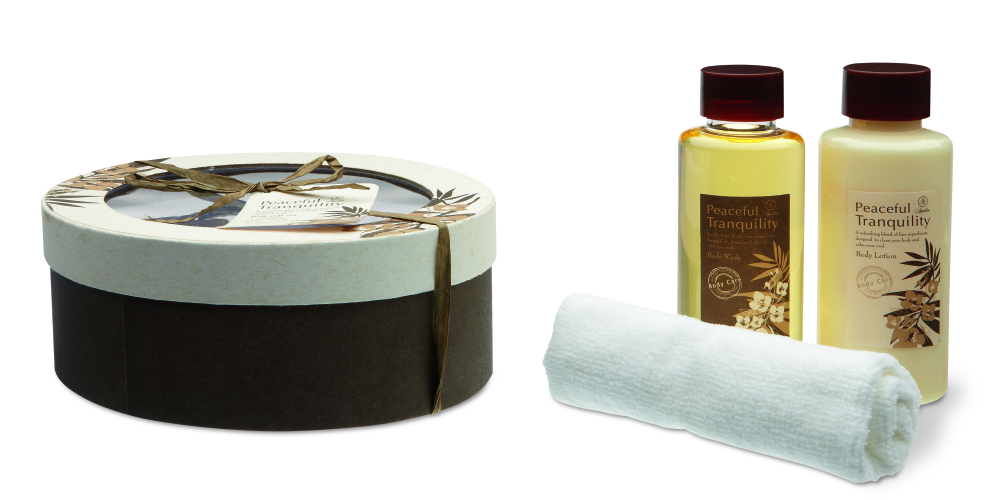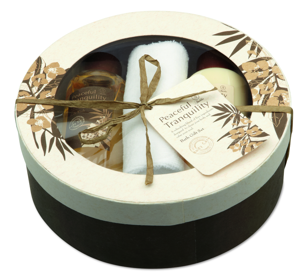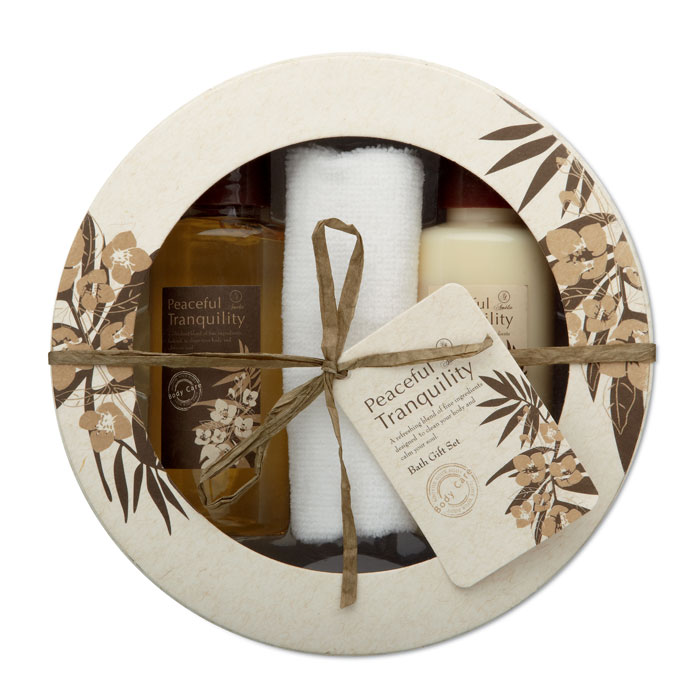 Zestaw kąpielowy zawierający żel do mycia, balsam do ciała oraz myjkę. Pakowany w okrągłe pudełko.