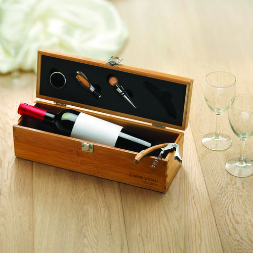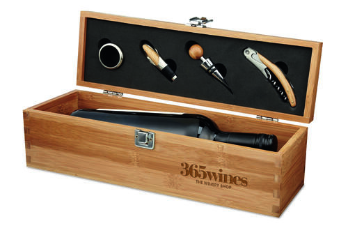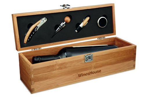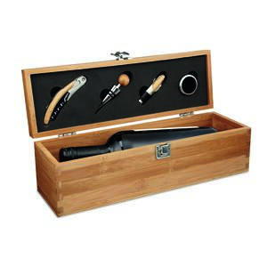 Ten zestaw do wina posiada wszystko czego potrzebujesz! W eleganckim pudełku wykonanym z bambusa znajduje się pierścień, nalewak, korek oraz korkociąg a do tego przygotowane miejsce na zapakowanie smakowitego wina.