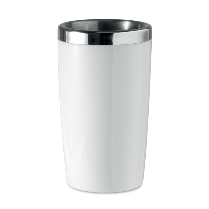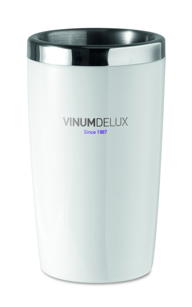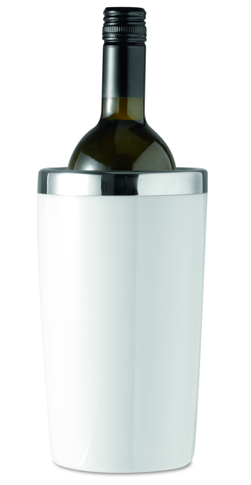 Schładzacz do butelek wykonany z połączenia stali nierdzewnej oraz plastiku na zewnątrz. Podwójne ścianki.
