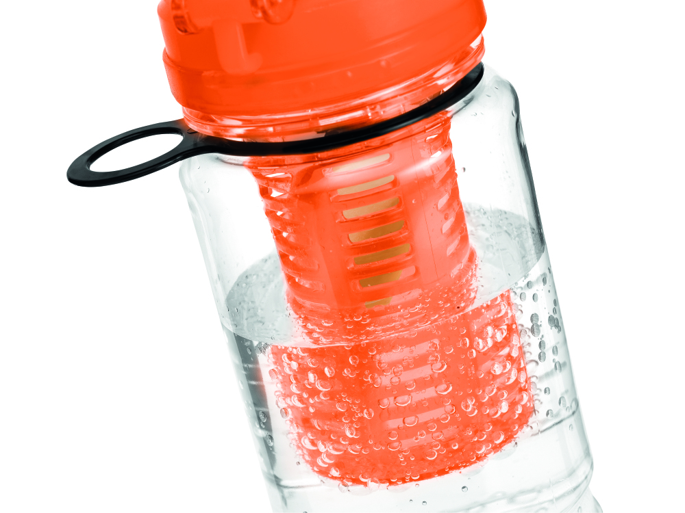 Bidon wykonany z TRITANU (nie zawiera BPA) z pojemnikiem na owoce lub mięte. Automatyczne otwieranie.