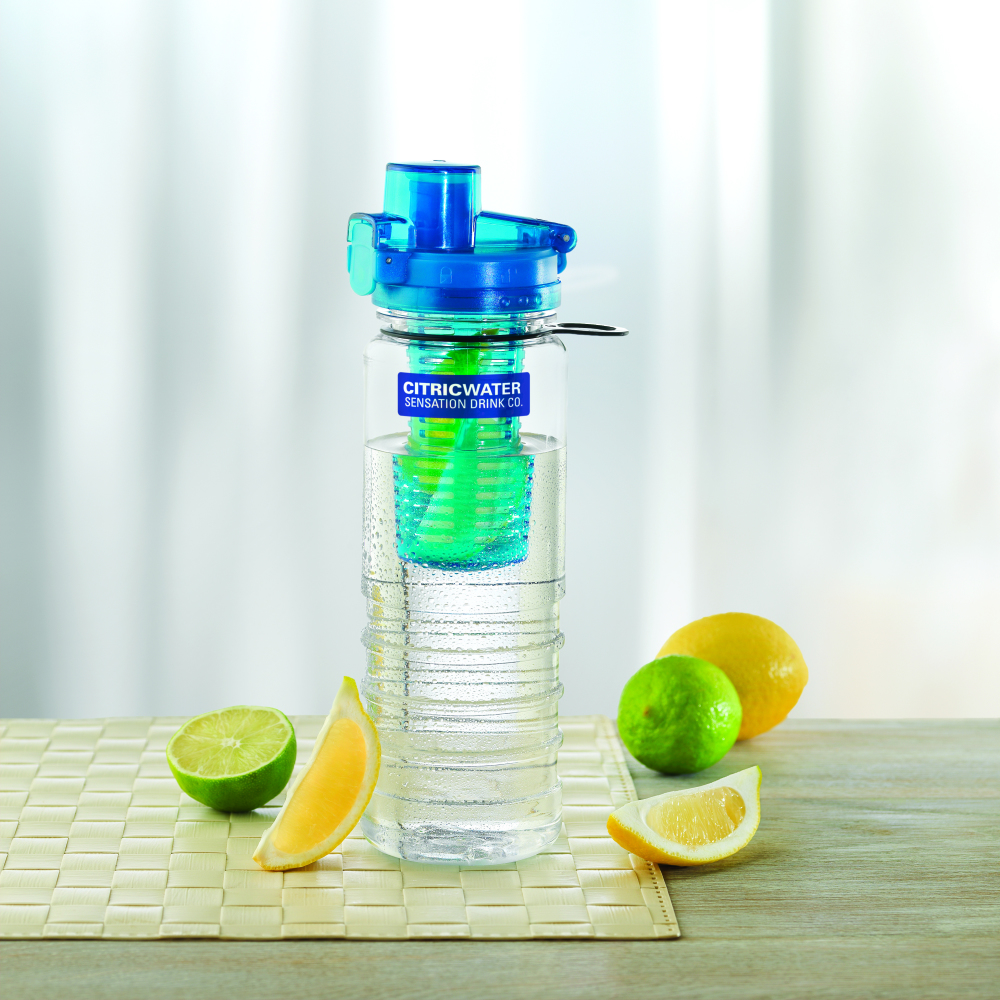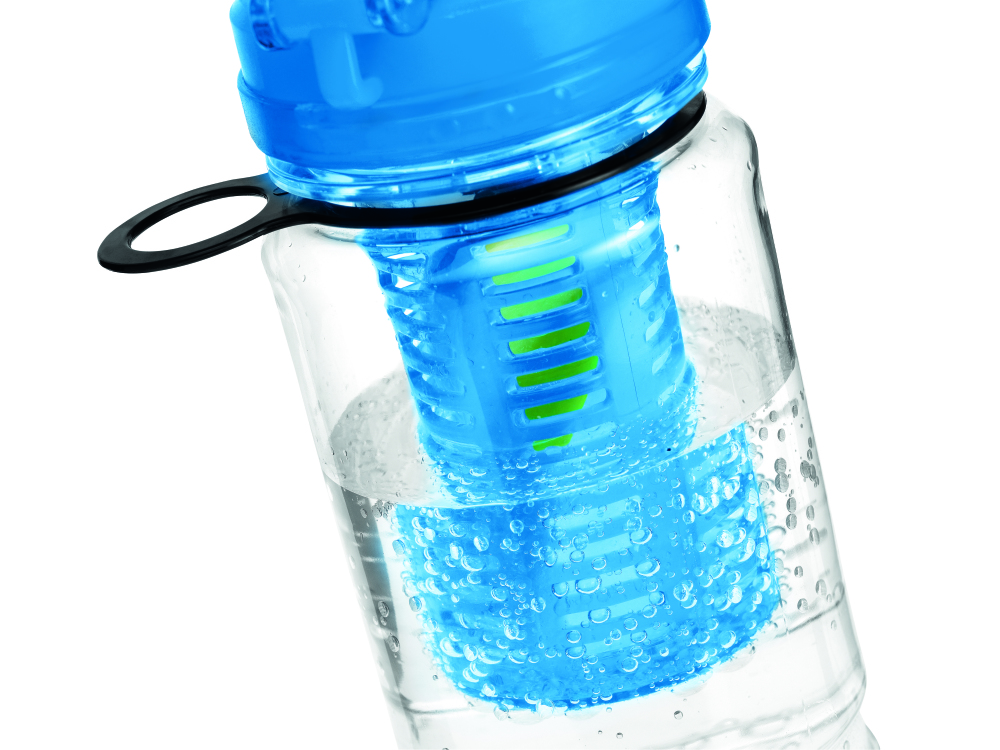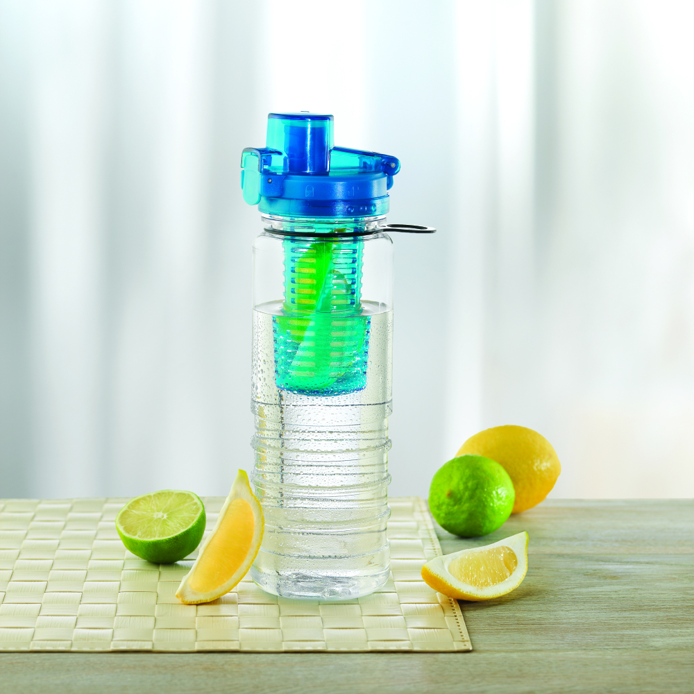 Bidon wykonany z TRITANU (nie zawiera BPA) z pojemnikiem na owoce lub mięte. Automatyczne otwieranie.