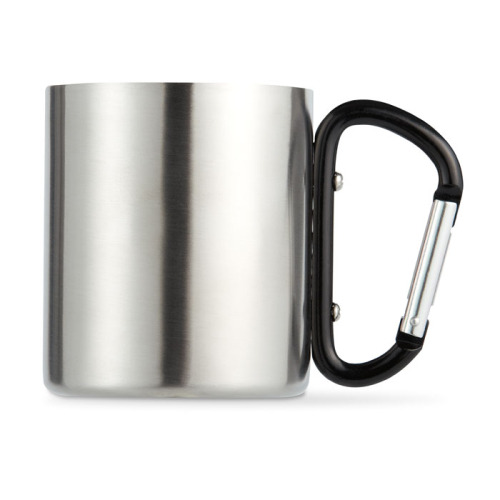 Metalowy kubek z uchwytem w postaci karabinka. Posiada podwójne ścianki, wykonany ze stali nierdzewnej.