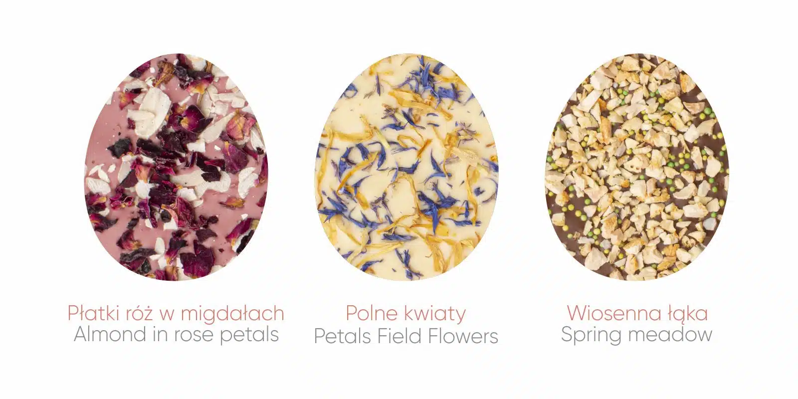 Choco Pisanka to solidna porcja czekolady o idealnie czystym składzie z wiosenną kolekcją dodatków do wyboru. Klasyk gatunku, czyli tabliczka w kształcie wielkanocnej pisanki, za to w opakowaniu okazałych gabarytów, które w całości zaprojektujemy zgodnie z Twoim pomysłem lub potrzebą. Twoje tabliczki wylewamy w naszej Czekoladowni dopiero, gdy zaakceptujesz finalny projekt graficzny. Dajemy Ci dzięki temu gwarancję absolutnej świeżości prezentu, który jest wizytówką Twojej firmy.
