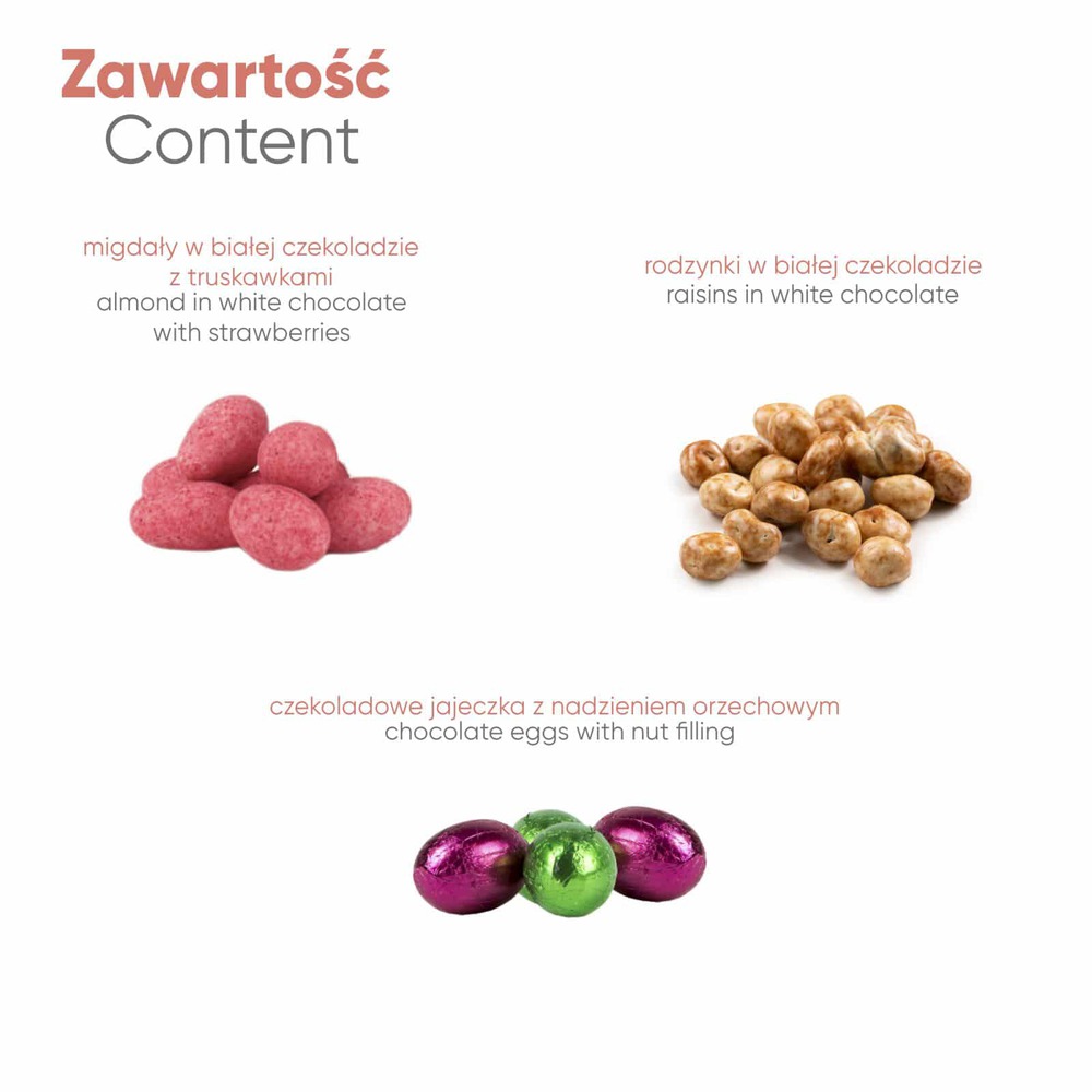 Torebka Bakaliowa to słodkość dla fanów orzeszków i bakalii pod każdą postacią. Nasza torebka jest entuzjastycznie przyjmowana przez okrągły rok, dlatego warto pamiętać o tym klasyku także na wiosnę! Bakalie, które przygotowujemy w naszej Bakalarni ze starannie wyselekcjonowanych składników i czekolady Top Gourmet, to jakościowa i zdrowa przekąska na wszystkie okazje, w tym te wielkanocne. W tym sezonie proponujemy 3 standardowe zawartości do wyboru: rodzynki w białej czekoladzie oprószone kawą, migdały w białej czekoladzie i pudrze z truskawek oraz klasyk wielkanocnego gatunku – czyli czekoladowe pisanki. W naszej Bakalarni powstaje jednak ponad 20 różnych rodzajów bakalii, dlatego jeśli masz ochotę na coś innego, z przyjemnością zrealizujemy takie zamówienie. Naturalny skład produktu tworzy spójną koncepcję z folią kompostowalną, w którą pakujemy nasze produkty oraz z papierową torebką z certyfikatem FSC. Opakowanie tego produktu to także duża powierzchnia do wykorzystania w Twojej komunikacji.