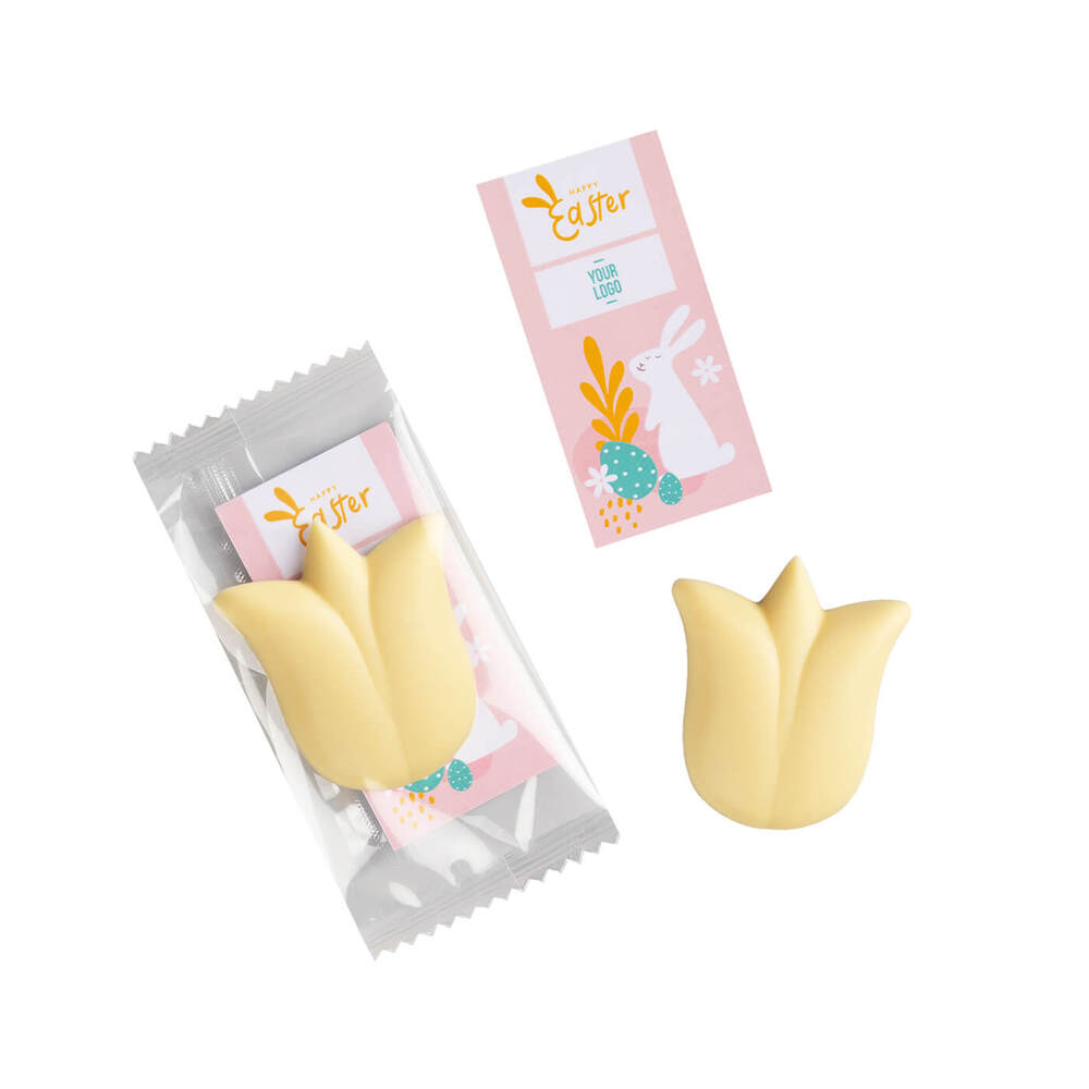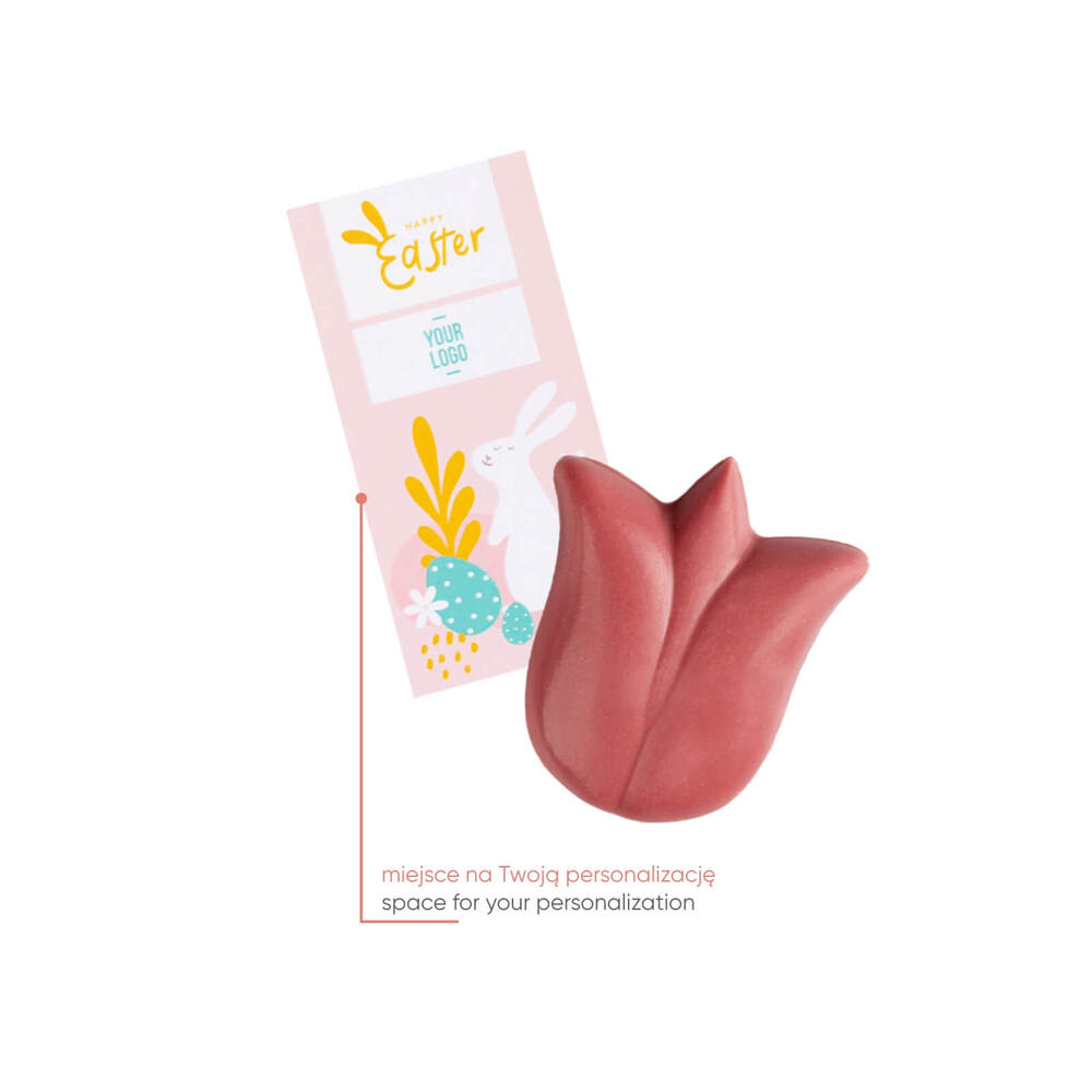 Poczuj słodki powiew wiosny i podziel się tym optymistycznym uczuciem z klientami i kontrahentami. Czekoladowe tulipany podbiją serca i kubki smakowe każdego, komu wręczysz taki firmowy upominek. Czekoladki w kształcie kwiatka możemy wykonać w pełnym bukiecie aż 10 kuwertur czekoladowych do wyboru. Jak w przypadku wszystkich produktów z naszej Czekoladowni, te kwiatowe słodkości przygotowujemy z czekolady jakości Top Gourmet, certyfikowanej Cocao Horizons. Papierowy bilecik – drukowany dwustronnie - to idealne miejsce na Twoje życzenia lub dowolny przekaz reklamowy. Zamawiaj do woli, ale zaczynamy już od nakładu 500 sztuk.