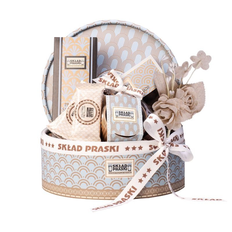 Papierowa tuba kryjąca asortyment tradycyjnych przysmaków Składu Praskiego: paluszki sezamowe, agrest w deserowej czekoladzie i kakao oraz orzechy prażone w karmelu z dodatkiem cynamonu, karmelizowane ciasteczka korzenne, kubeczek pitnej czekolady z piankami, migdały w białej czekoladzie z truskawką. Całość w zamkniętym pudełku z wypełnieniem i dekoracją.