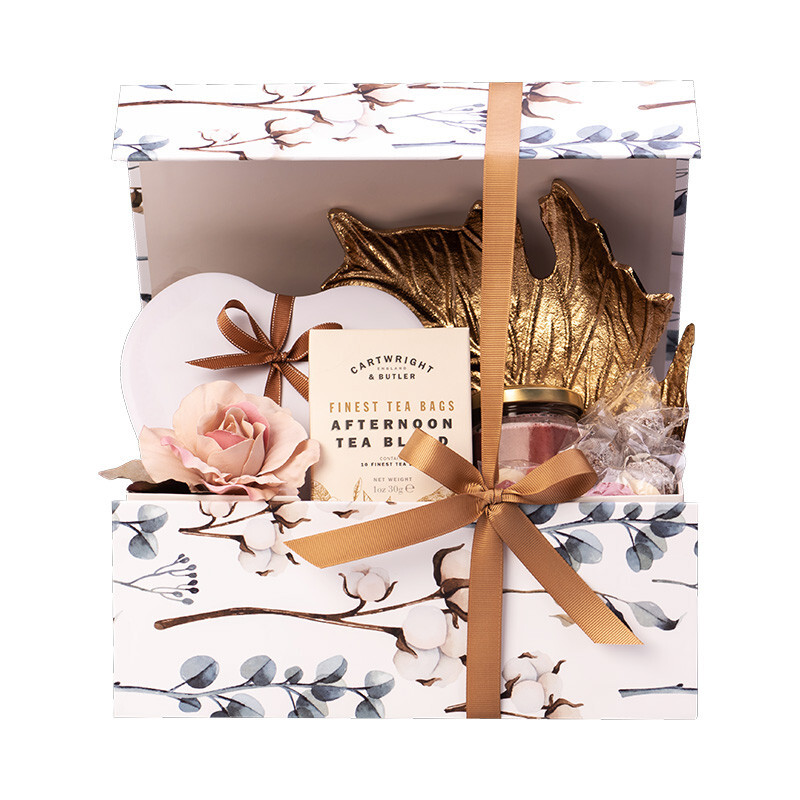 Ręcznie kaszerowane pudełko kryjące: puszkę kruchych ciasteczek korzennych, słoiczek miodu z porzeczkami, czarną herbatę Afternoon Blend, daktylowe kule z bakaliami i kokosem, naturalne karmelki wiśniowe oraz dekoracyjny talerz metalowy. Całość w zamkniętym kuferku z wypełnieniem i dekoracją.