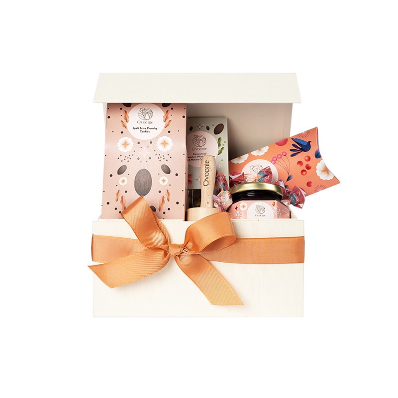 Papierowy, ręcznie kaszerowany kuferek kryjący asortyment naturalnych produktów Ovocnie: ciasteczka migdałowe słodzone syropem z agawy, migdały w białej czekoladzie z certyfikatem Cocoa Horizons, oprószone zieloną herbatą matcha, batonik o zawartości 48% owoców, ręcznie robione karmelki na bazie zielonej herbaty matcha i naturalnej śmietanki, drewnianą pieczątkę do ciasteczek, konfiturę borówkową z dodatkiem jabłek i skórki pomarańczowej. Całość w zamkniętym pudełeczku z wypełnieniem i dekoracją (*opakowanie do ponownego wykorzystania). * Papier wykorzystany do produkcji opakowań Ovocnie posiada certyfikat FSC, co oznacza, że został pozyskany z poszanowaniem środowiska naturalnego. Folie występujące w produktach Ovocnie nadają się do kompostowania.