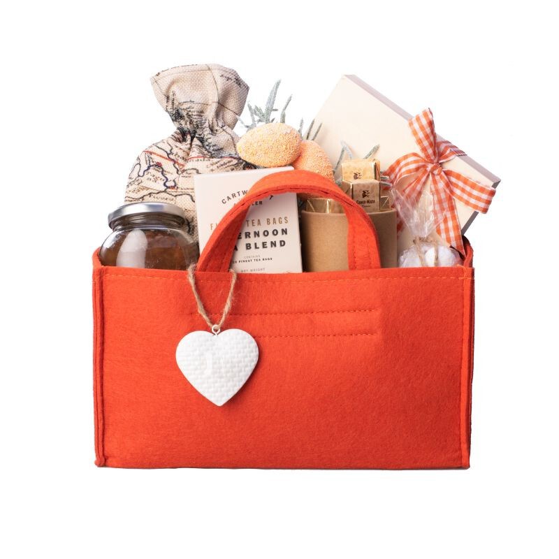 Filcowy kosz (*opakowanie do ponownego wykorzystania) z wypełnieniem i dekoracją kryjący: butelkę aromatycznego syropu do herbaty z pomarańczy z dodatkiem rumu, angielską czarną herbatę Afternoon Blend, nadziewane pralinki czekoladowe, woreczek kruchych ciasteczek do herbaty, asortyment czekoladowych trufli w drewnianej skrzyneczce, nugaty z miodem i orzechami, tubę orzechów w karmelu.