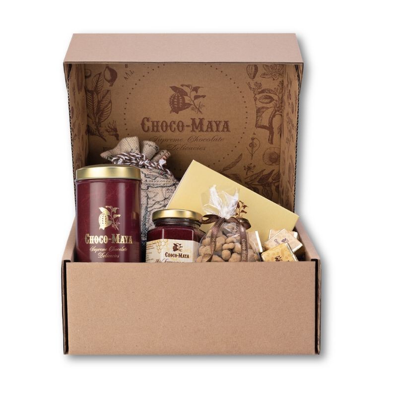 Kartonowe pudełko kryjące: asortyment produktów kolonialnych Choco Maya: puszkę marmoladek pektynowych, słoiczek musu malinowego, wytrawne trufle czekoladowe, woreczek kruchych ciasteczek, pralinki czekoladowe, migdały w czekoladzie mlecznej z certyfikatem Cocoa Horizons, oprószone cynamonem. Całość w zamkniętym pudełku z wypełnieniem i dekoracją.