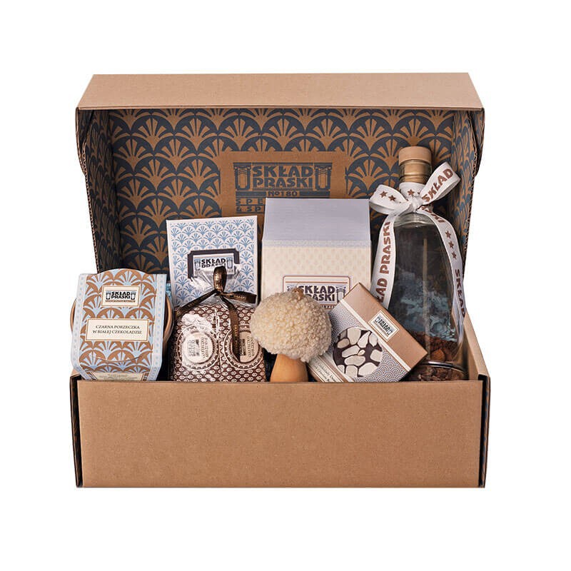 Kartonowe pudełko kryjące asortyment produktów Skład Praski: butelkę wypełnioną przyprawami i cukrem trzcinowym (zestaw do samodzielnego wykonania świątecznej nalewki), Toruńskie Pierniczki, czarne porzeczki w białej czekoladzie z certyfikatem Cocoa Horizons oprószone pudrem z owoców leśnych, karmelizowane ciasteczka korzenne z cynamonem, tabliczkę certyfikowanej czekolady z bakaliami, śliwki w czekoladzie. Całość w zamkniętej puszce z wypełnieniem i dekoracją (*opakowanie do ponownego wykorzystania).