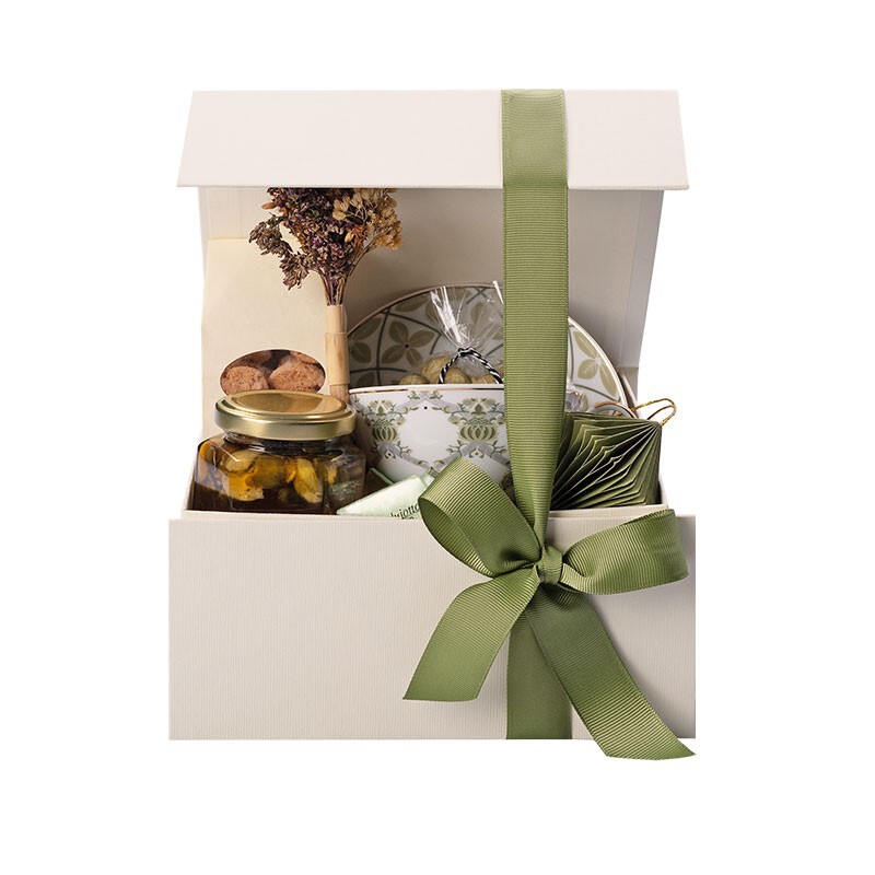 Ręcznie kaszerowany kuferek kryjący: ręcznie malowaną, porcelanową filiżankę do herbaty ze spodeczkiem z fabryki w Ćmielowie, BIO herbatę na drewnianym mieszadełku z kwiatem lipy, czarnego bzu i owocem maliny, mini ciasteczka owsiane 22% żurawin, prażone orzechy laskowe w białej czekoladzie oprószone zieloną herbatą matcha, pralinki z orzechowym kremem gianduja, słoiczek włoskich orzechów w miodzie. Całość w zamkniętym pudełku z wypełnieniem i dekoracją (*opakowanie do ponownego wykorzystania).