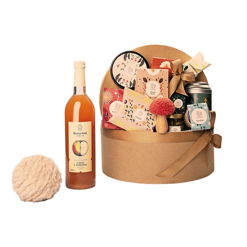 Papierowa tuba kryjąca BIO sok jabłkowy z kolekcjonerskiej, starej odmiany Piękna z Herrnhut uprawianej w ekologicznym sadzie w czystej i pięknej okolicy Doliny Baryczy, na Dolnym Śląsku oraz asortyment naturalnych produktów Ovocnie: Pigwówka sporządzona na owocach pigwy i pigwowca, zielona herbata Sencha z płatkami kwiatów i skórką cytrynową, chipsy jabłkowe, ciasteczka migdałowe słodzone syropem z agawy, tabliczka mlecznej czekolady z certyfikatem Cocoa Horions z dodatkiem solonych migdałów, pełnoziarniste kule z morelą, chipsy kokosowe, słoiczek pestek dyni w miodzie, Toruński Pierniczek w czekoladzie, świeca w słoju. Całość w zamkniętym kuferku z wypełnieniem i dekoracją (*opakowanie do ponownego wykorzystania). * Papier wykorzystany do produkcji...