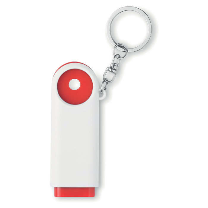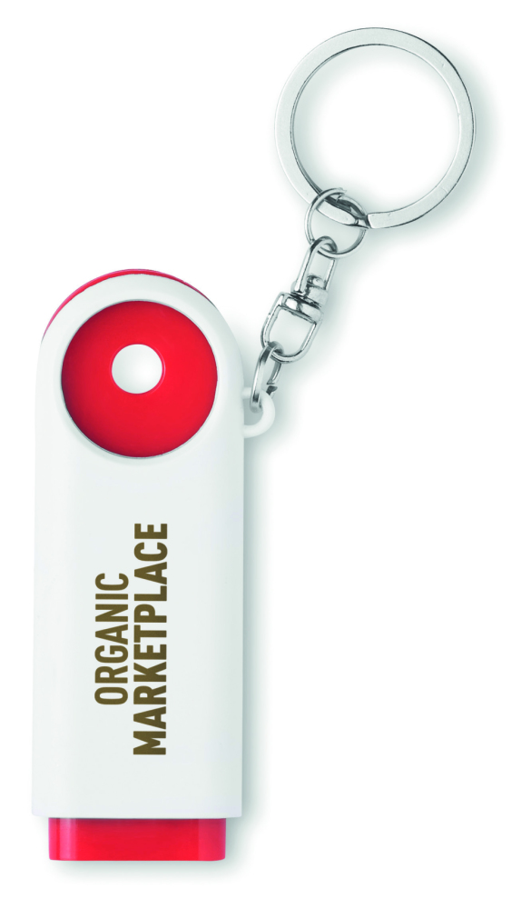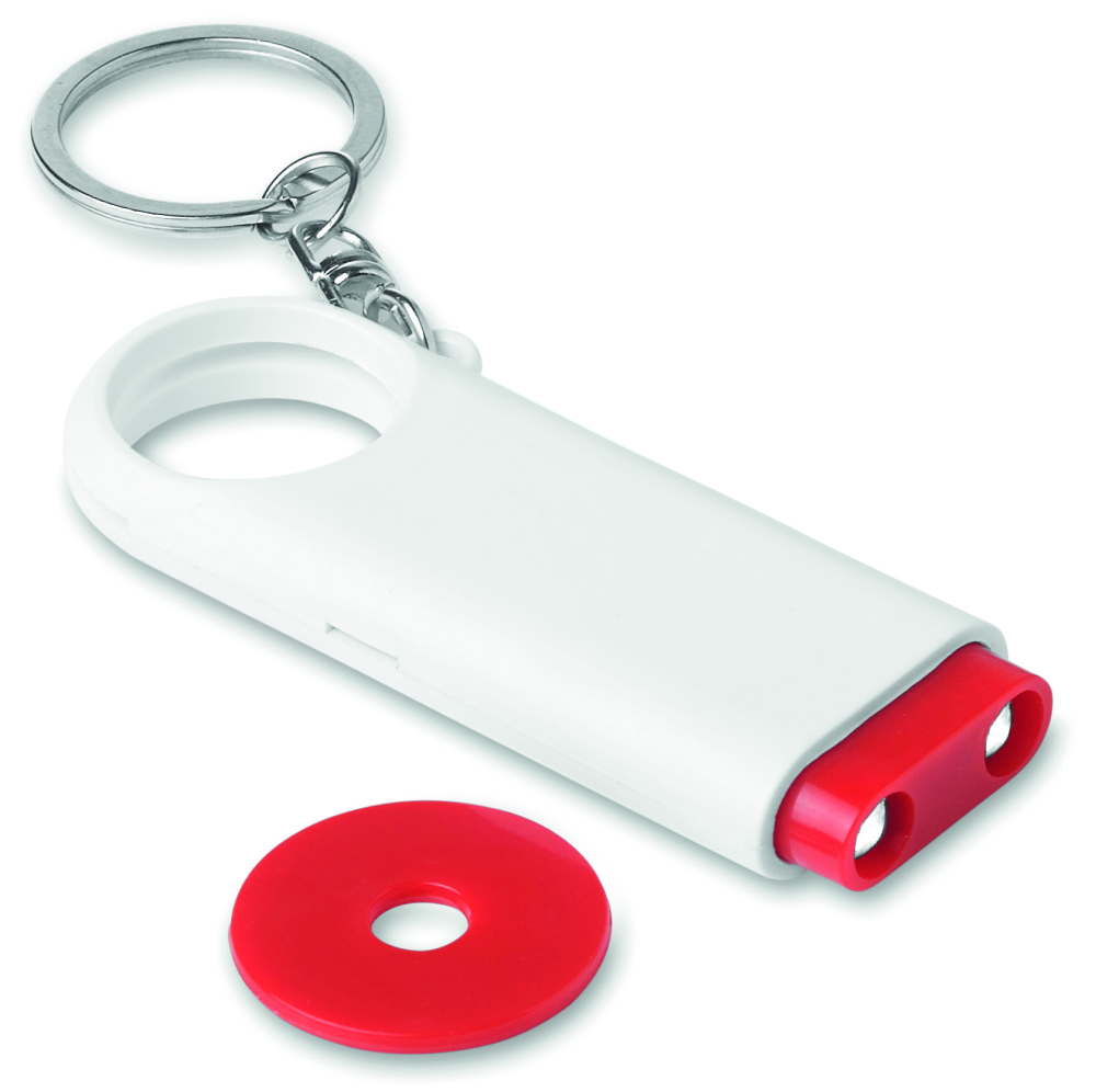 Brelok na klucze wykonany z plastiku z latarką (2 LED) i żetonem do wózków, o wymiarach odpowiadających 1 EUR. Bateria CR1220 w komplecie.