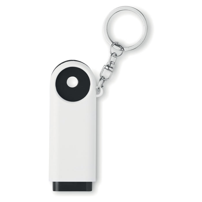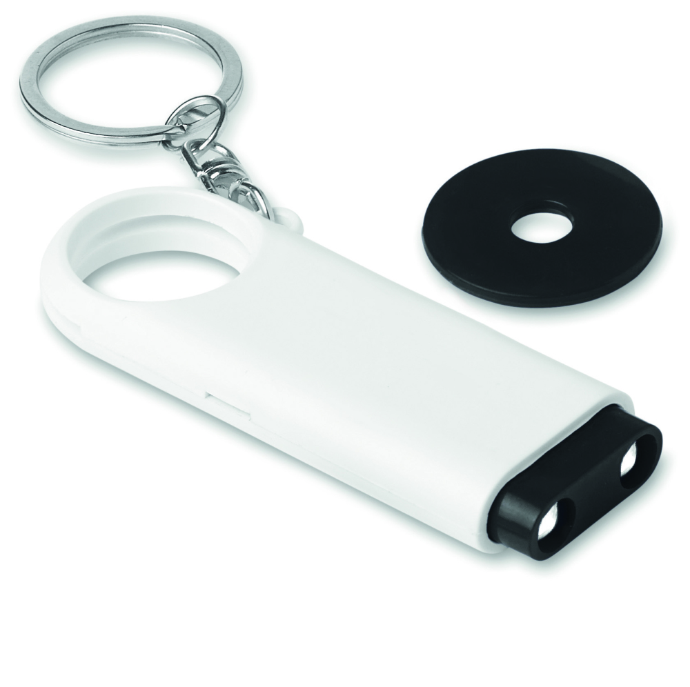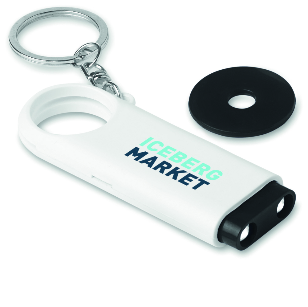 Brelok na klucze wykonany z plastiku z latarką (2 LED) i żetonem do wózków, o wymiarach odpowiadających 1 EUR. Bateria CR1220 w komplecie.