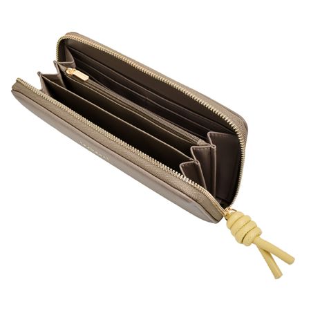 Portfel Apolline w kolorze czarnym jest wykonany z miękkiej, matowej, wysokiej jakości skóry wegańskiej (PU) i posiada eleganckie złote wykończenia dla wyrafinowanego wykończenia. Sygnowany złotym logo TPU z przodu, portfel ten łączy luksus z praktycznością. Zabawny suwak w kształcie węzła w kolorze ciemnoszarym dodaje zabawnego akcentu klasycznemu wzornictwu portfela. Miękki, kolorowy i zabawny portfel Apolline doskonale uzupełnia kolekcję toreb Apolline.