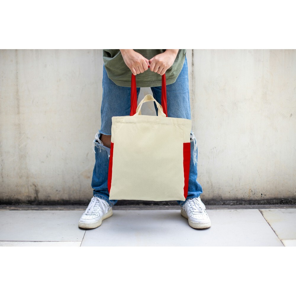Torba na zakupy, posiada krótkie uchwyty oraz długie uchwyty umożliwiające noszenie na ramieniu, 2 kieszenie boczne dopasowane kolorystycznie do długich uchwytów, produkt wykonany z bawełny o gramaturze 240 g/m2