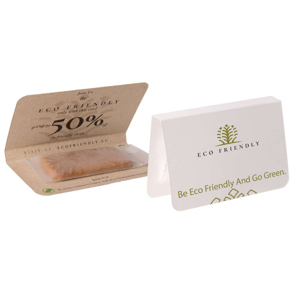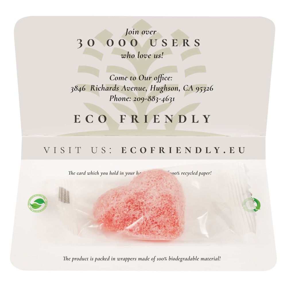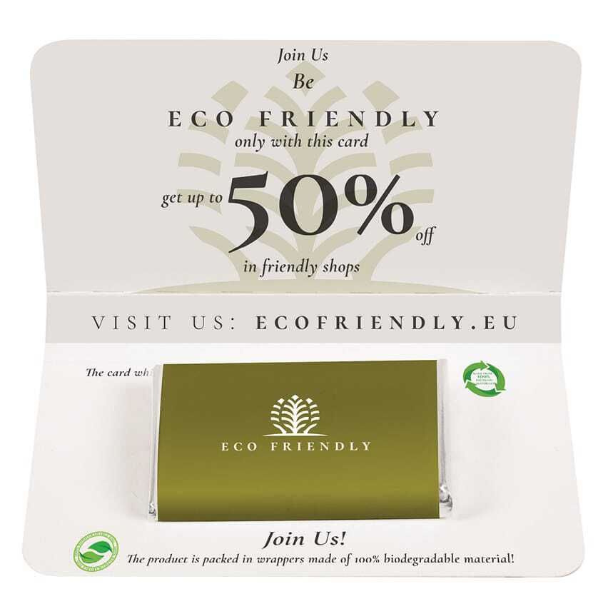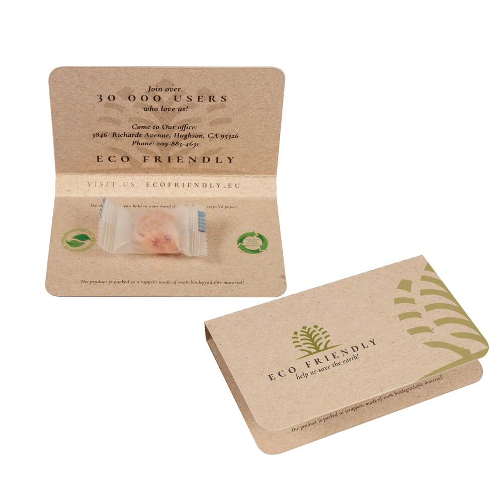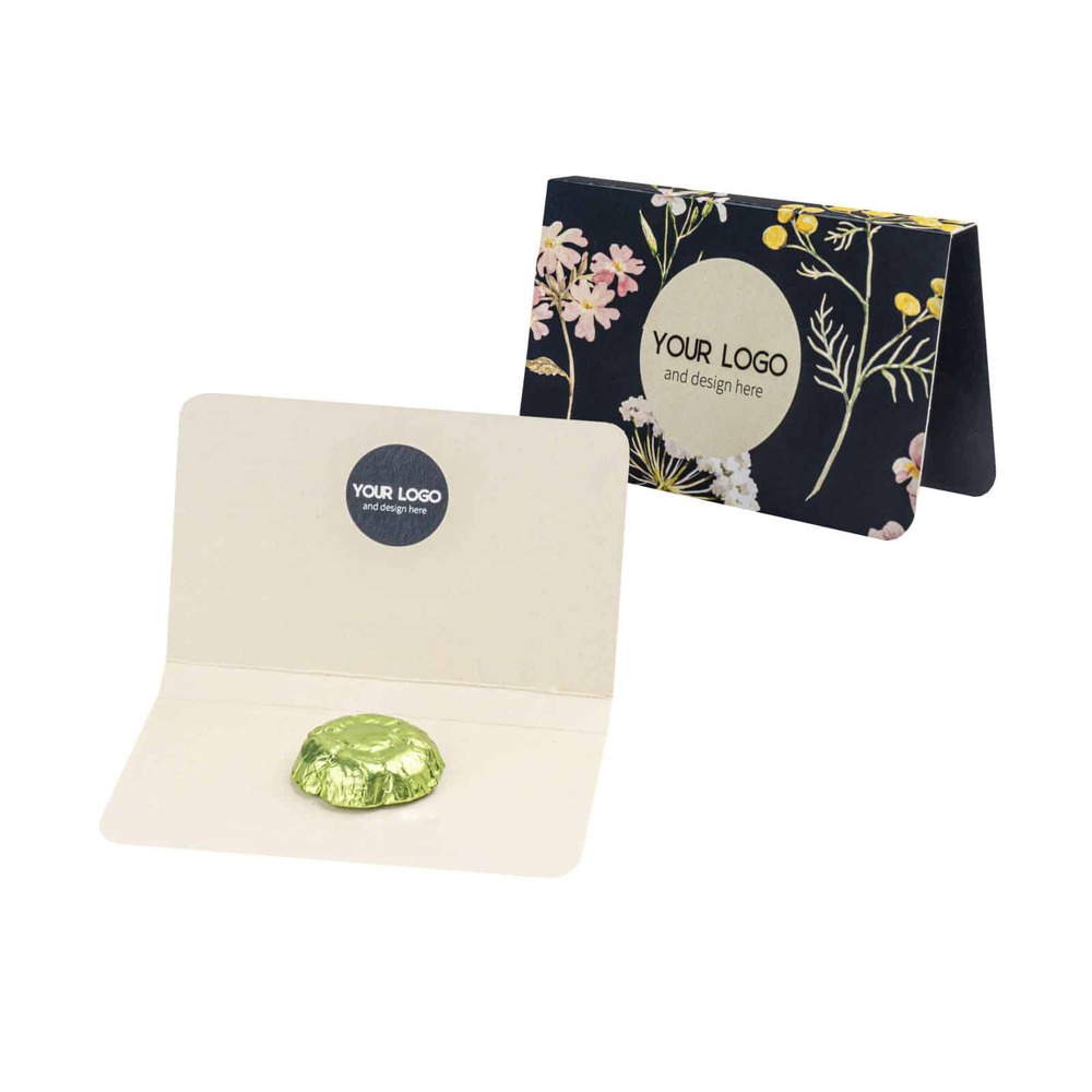 Do naszych standardowych zawartości dodaliśmy też trzy nowości: mini czekoladki w kształcie serca, gwiazdki i kwiatka. Każda z nich zapakowana jest w 1 z 3 standardowych kolorów folii, ale istnieje również możliwość dostosowania jej do projektu, w tym zadruk Twoim logotypem! Karnet wykonany został z papieru certyfikowanego FSC.