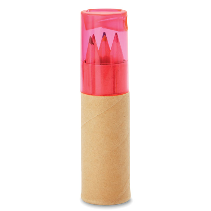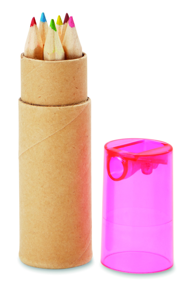 Zestaw 6 kredek w tubie z kartonu. Przezroczyste wieczko z temperówką.