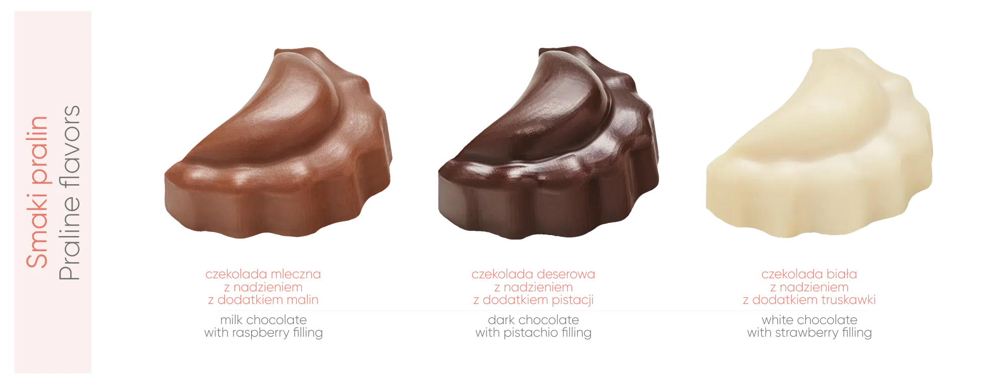 Kto nie lubi pierogów? A może spróbujecie je w wersji czekoladowej? W zestawie znajduje się 7 czekoladek w kształcie pierogów, w 3 pysznych wariantach smakowych: