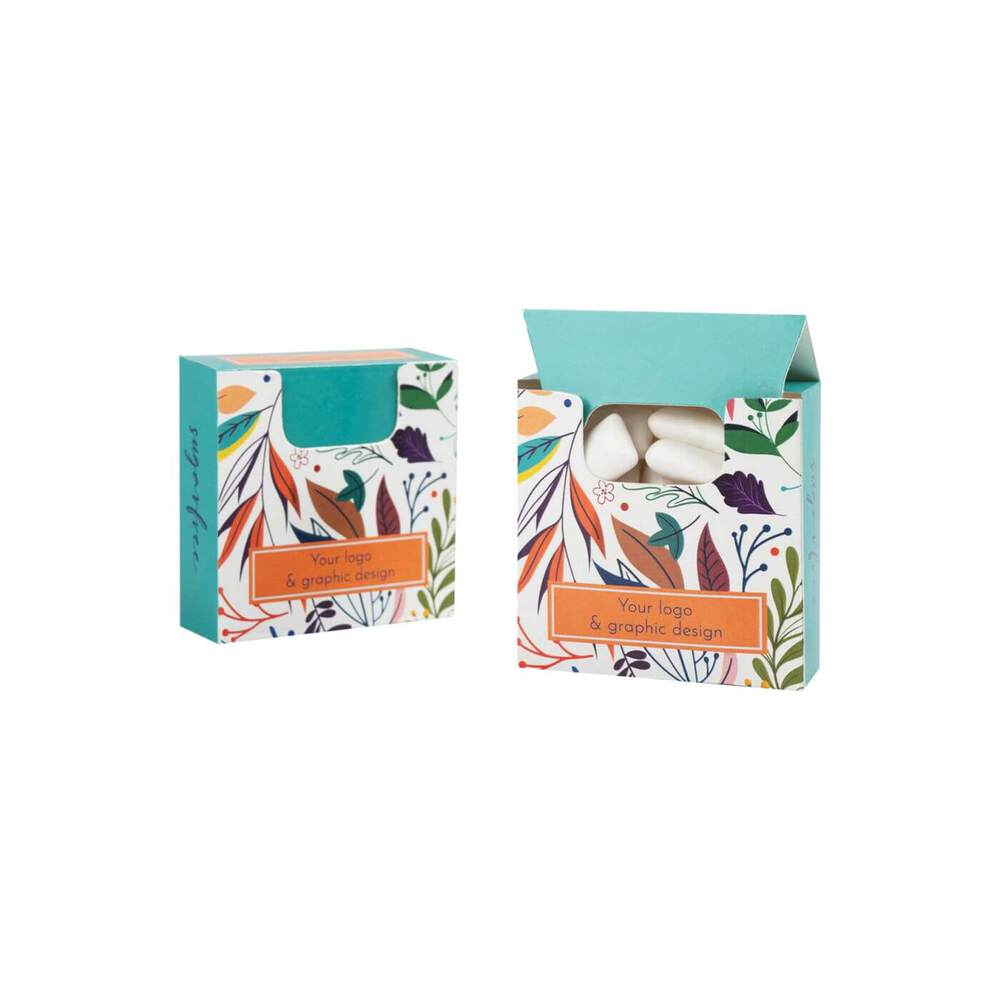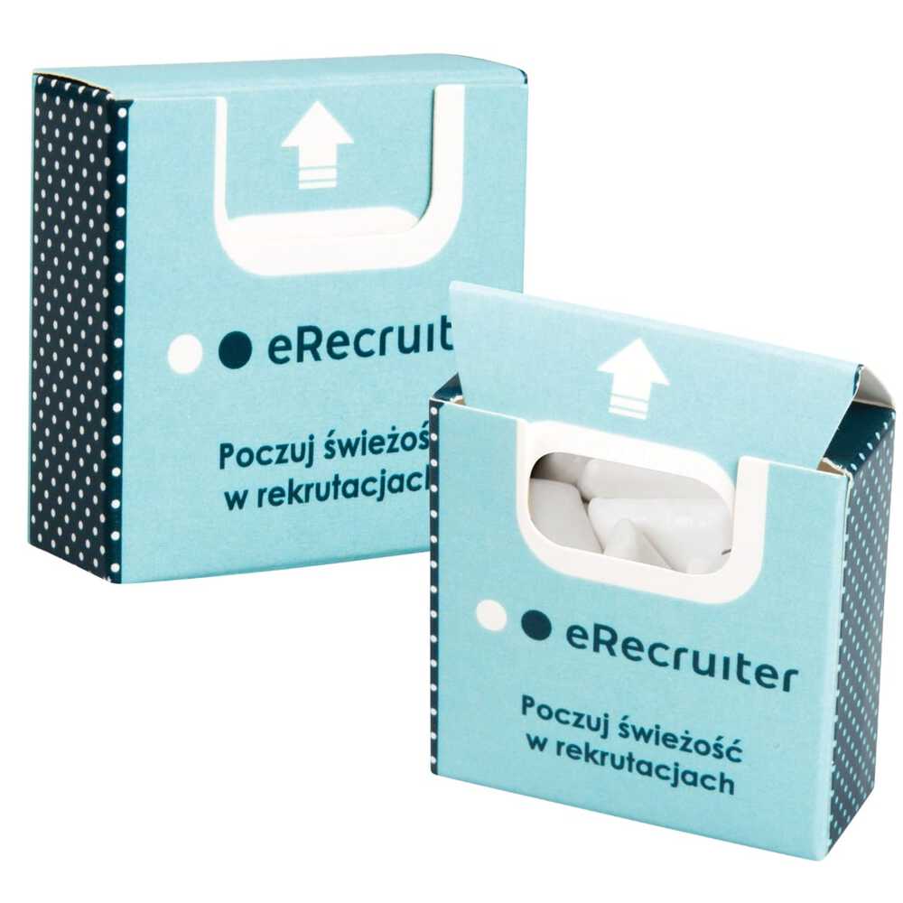 Odśwież przekaz reklamowy swojej marki z orzeźwiającymi drażetkami i gumami do żucia. Pudełeczko papierowe o nowoczesnym kształcie z wygodnym otwarciem, które ułatwia częstowanie, możemy wypełnić dla Ciebie owocowymi lub miętowymi drażetkami albo gumami do żucia bez cukru.