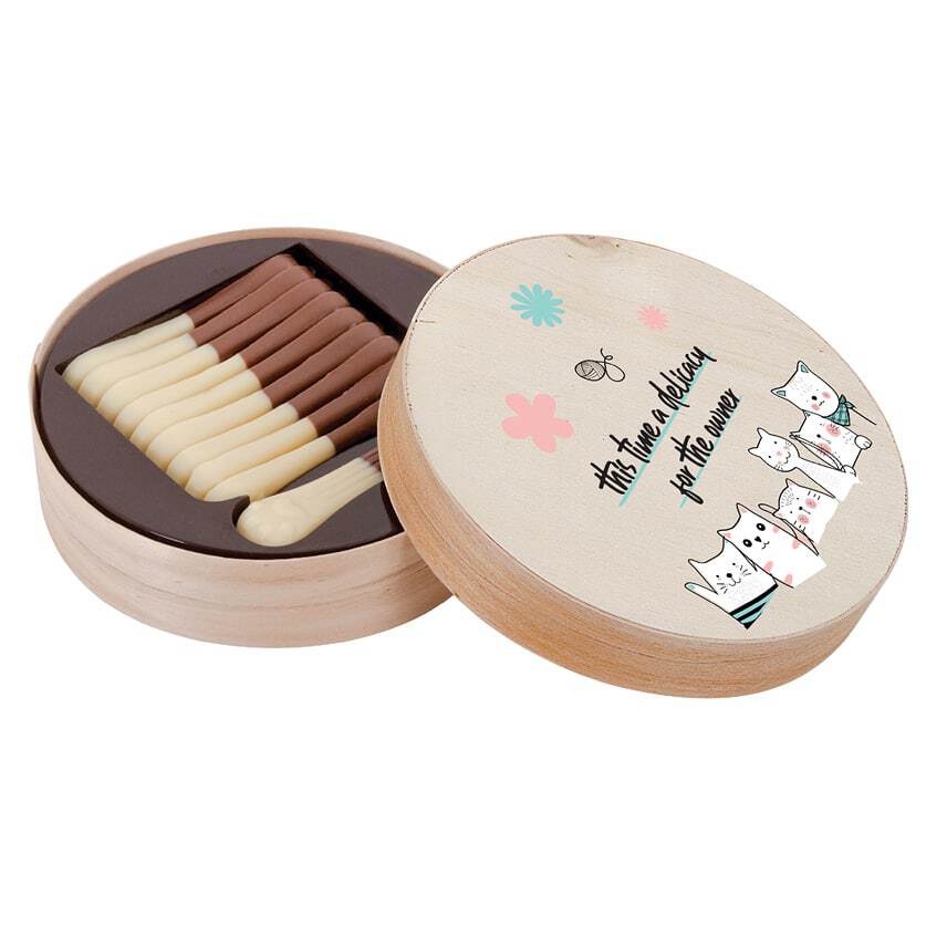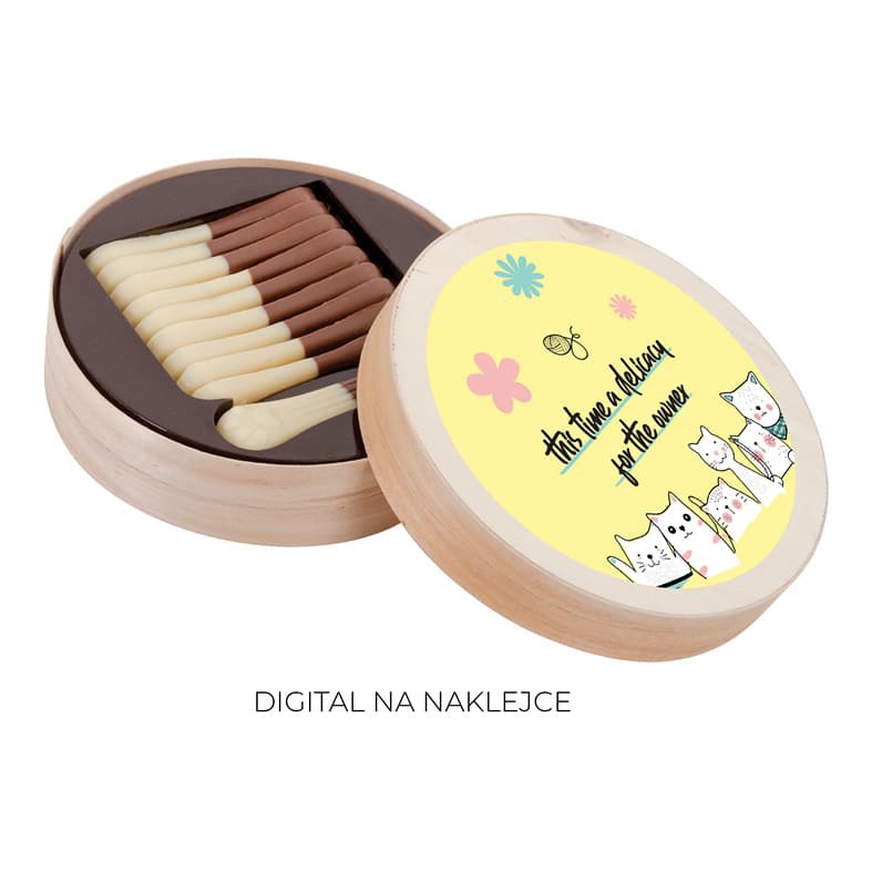 W eleganckim drewnianym pudełku znajdziesz czekoladek o łącznej wadze 80 g, zapakowanych w wypraskę wykonaną z R-PET - czyli PET pochodzący z recyklingu. Możliwość personalizacji etykiety lub nadruku bezpośrednio na pudełku daje Ci swobodę w tworzeniu unikatowego prezentu, który idealnie odzwierciedli charakter Twojej marki. Etykieta może być biała lub kraft, a rodzaj personalizacji jest zależny od Twoich preferencji.