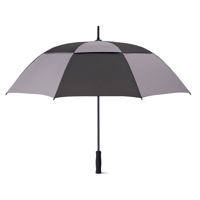 Odporny na wiatr parasol o średnicy 27 cali. Materiał: poliestr 190T, rączka z EVA. Stelaż z lakierowanego na czarno włókna szklanego i czarne plastikowe końcówki. Ręcznie otweirany.